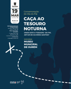 5.ª FEIRA / 19 MAR. MUSEU MUNICIPAL DE OURÉM | CASA DO ADMINISTRADOR 20:30H Artur de Oliveira Santos, o administrador de Ourém, figura carismática e pai de família, é apresentado aos participantes de um jogo cujo percurso de vida se cruza com a história recente de Ourém. Por entre cenários familiares e histórias do quotidiano, as perguntas e respostas guiam o visitante até ao tesouro herdado de Artur. Onde foi deixado esse tesouro? Inscrição gratuita e obrigatória Público: famílias 249…