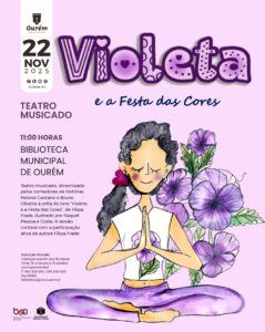 SÁBADO / 22 NOV. BIBLIOTECA MUNICIPAL DE OURÉM 11:00H Crianças a partir dos 18 meses Teatro musicado, dinamizado pelos contadores de histórias Helena Caetano e Bruno Oliveira à volta do livro “Violeta e a Festa das Cores”, com a presença especial da autora Filipa Frade. Inscrição prévia e obrigatória 962 364 365 | 249 540 900 (ext. 6841) | biblioteca@cm.ourem.pt