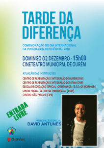 Numa tarde inteiramente dedicada à comemoração do Dia Internacional da Pessoa com Deficiência, será possível assistir às atuações das instituições Centro de Reabilitação e Integração de Ourém (CRIO), Centro de Reabilitação e Integração de Fátima (CRIF), Escola de Educação Especial “Os Moinhos”, Centro Social da Divina Providência e Centro João Paulo II. O espetáculo contará ainda com a participação especial de David Antunes Organização: Grupo da Diferença com o apoio do Município de Ourém