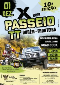 Realiza-se a 1 de dezembro a 10ª edição da iniciativa Passeio TT Ourém – Fronteira para jipes, motos e quads. A prova será de dificuldade média, com aproximadamente 220 km. Além do passeio, esta edição contará com um concerto da banda oureense “The Peorth”, no local de chegada. Este evento organizado pelos Bombeiros Voluntários de Ourém e OuréMotor Clube 4x4, conta com o apoio do Município de Ourém.