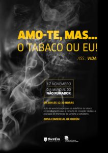 No dia 17 de novembro comemora-se o Dia Mundial do Não Fumador, e o Município em parceria com a UCC de Ourém vão realizar, no dia 16 de novembro, uma ação de sensibilização na zona comercial de Ourém no período da manhã, das 9.30h às 12.30h.