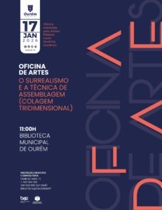 SÁBADO / 17 JAN. BIBLIOTECA MUNICIPAL DE OURÉM 11:00H Oficina orientada pela Artista Plástica Laura Severino Lourenço, que vai muito além do simples ato de desenhar ou pintar. Trata-se de um momento de convivência intergeracional, onde as famílias se podem expressar livremente através das artes visuais. A orientação da Laura Severino Lourenço, com a sua experiência sensível e poética, convida os participantes a experimentarem técnicas variadas como colagem, pintura, escultura, desenho e assemblagem, sempre com foco na liberdade criativa, no…