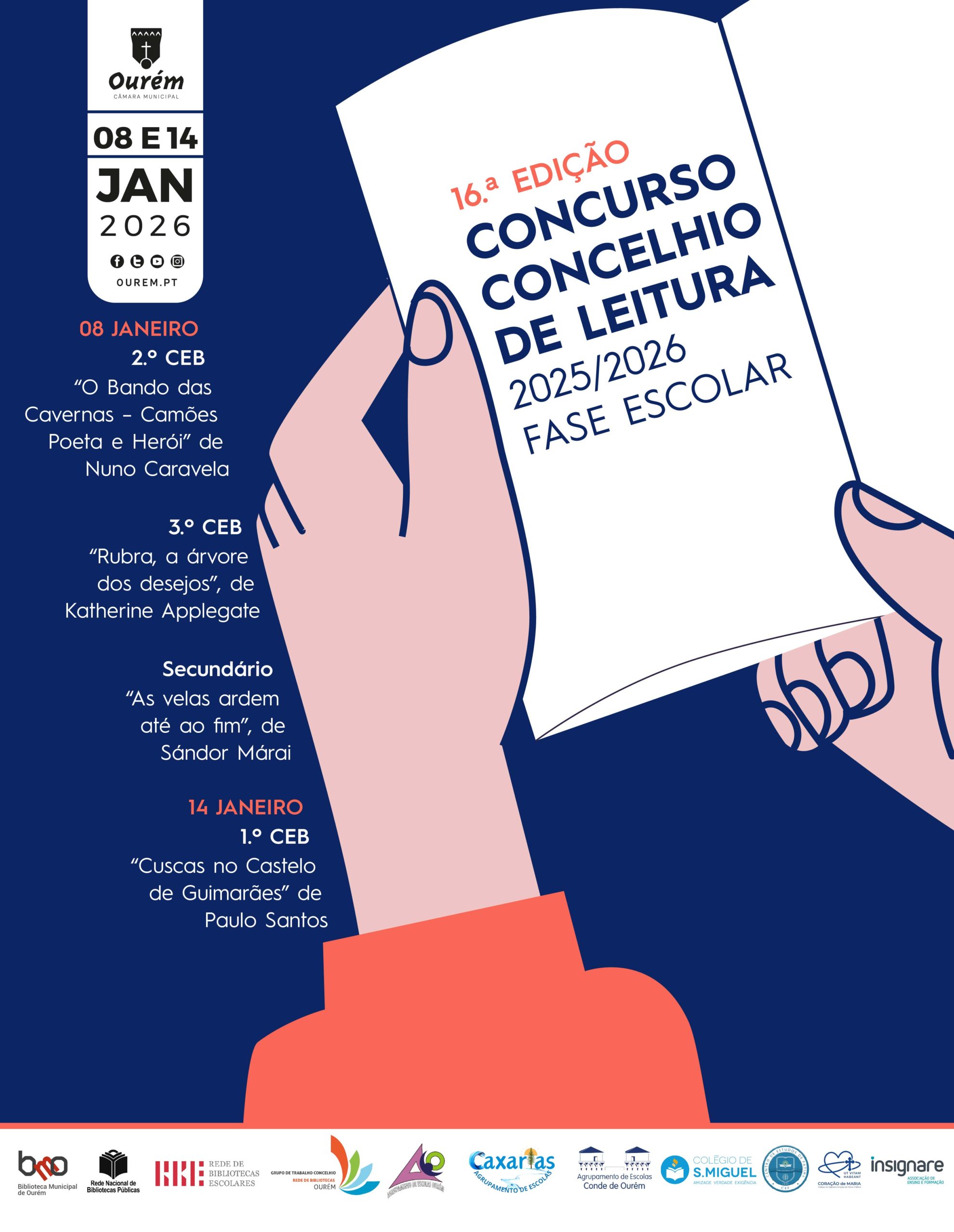 1º CEB – “Cuscas no Castelo de Guimarães” de Paulo Santos. O Concurso Concelhio de Leitura é uma iniciativa promovida pela RCBO – Rede Concelhia de Bibliotecas de Ourém, que tem como propósito celebrar o prazer de ler e escrever, valorizando a leitura como prática universal e formativa. O concurso pretende incentivar o contacto com a literatura e fomentar o gosto pela leitura entre os alunos do 1.º, 2.º e 3.º Ciclos do Ensino Básico, bem como do Ensino Secundário e Profissional. Os alunos apurados na Fase Escolar terão a oportunidade de representar os seus estabelecimentos de ensino na Fase Municipal, que decorrerá no dia 03 de março de 2026, no Auditório (piso 1) do Edifício Sede do Município de Ourém.