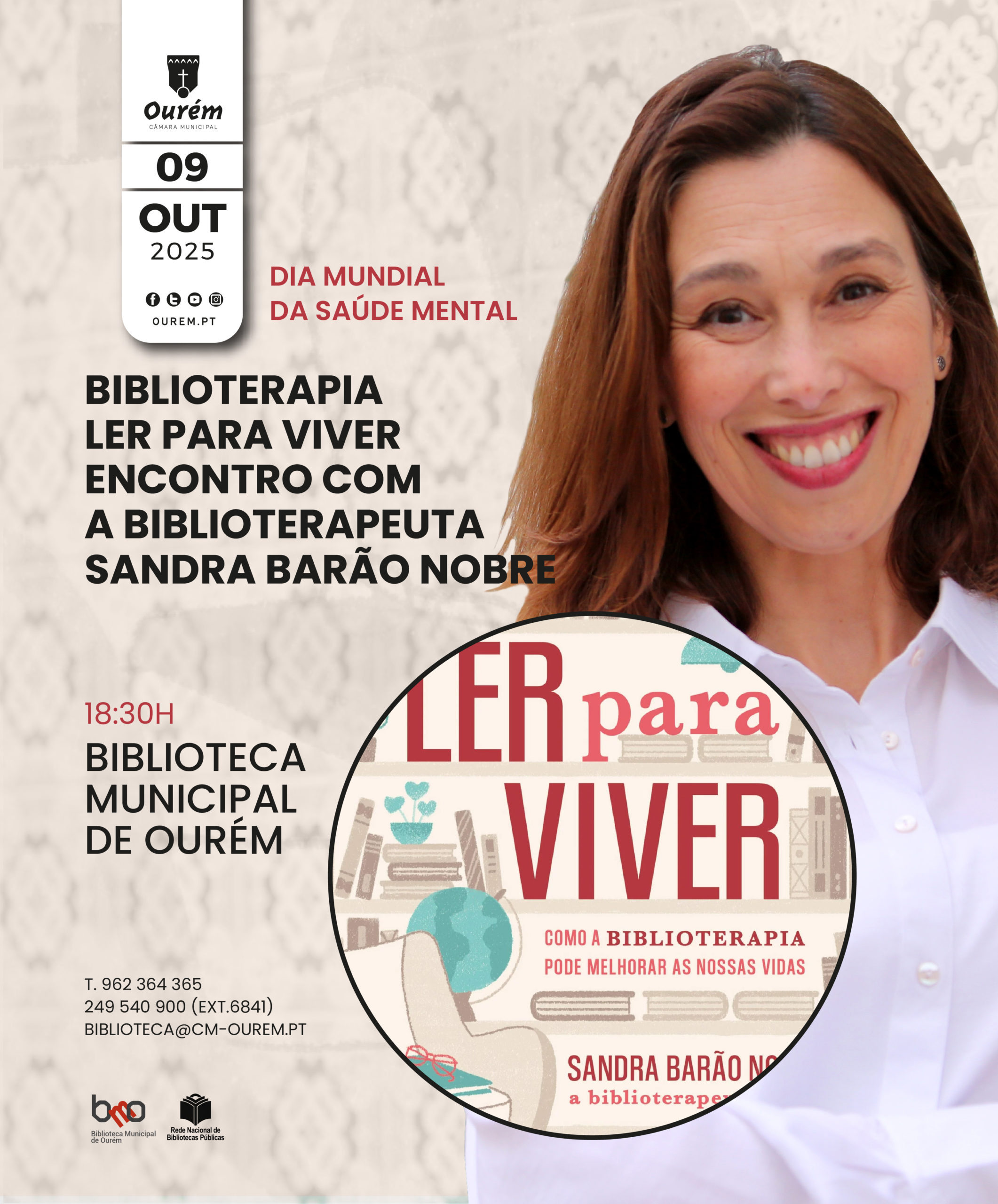 O Dia Mundial da Saúde Mental é celebrado, anualmente, a 10 de outubro e tem como objetivos desmistificar algumas das crenças associadas às doenças mentais, reconhecer os sinais deste tipo de doenças e sensibilizar para a importância do acesso aos cuidados de saúde mental. A 09 de outubro de 2025 a Biblioteca Municipal de Ourém receberá a Biblioterapeuta Sandra Barão Nobre, num encontro que permitirá aos participantes perceber qual o objetivo, em que consiste e como funciona a Biblioterapia, bem como conhecer os seus benefícios e como podemos aplicá-la em prol da nossa saúde global: física,