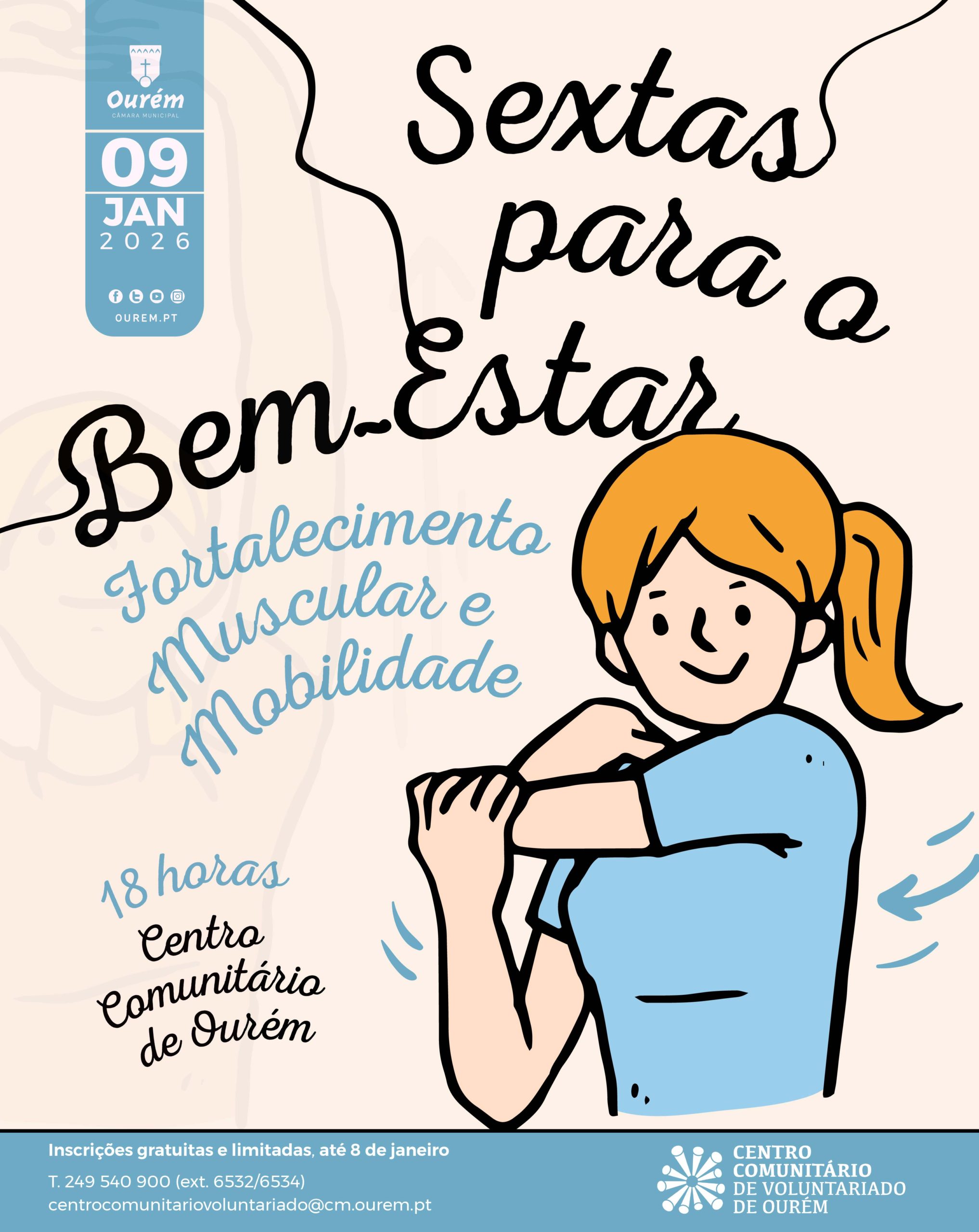 O projeto “Sextas para o Bem-Estar” é dinamizado às 18:00H no Centro Comunitário de Voluntariado. Em cada mês há um tema diferente. No mês de janeiro, a sessão será dedicada ao tema “Fortalecimento Muscular e Mobilidade”.