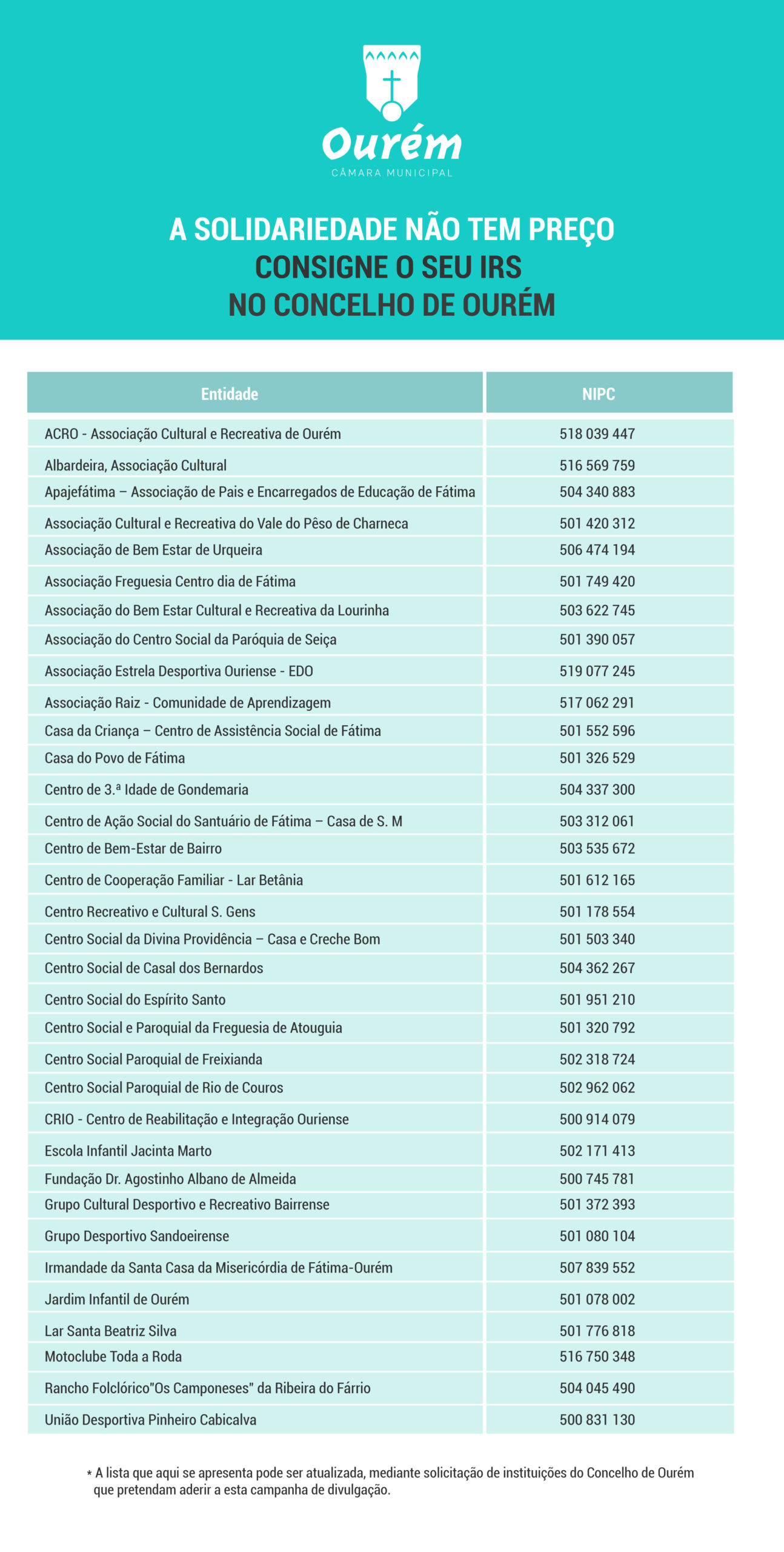 O Município de Ourém está novamente a promover uma campanha que pretende sensibilizar os oureenses para a possibilidade de consignarem 0,5% do respetivo IRS a uma IPSS ou a uma Instituição de Utilidade Pública do nosso Concelho.